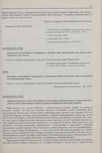 Заявление Святейшего Патриарха Тихона при подписании им своего послания от сего числа. 19.01(01.02).1918 г. // Послание Святейшего Патриарха Тихона от 19.01(01.02).1918 г. (одно из изданий).