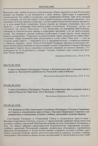 Выписка из Постановления Святейшего Патриарха Тихона и Священного Синода в соединенном присутствии с Высшим Церковным Советом о мероприятиях к сохранению духовно-учебных заведений в ведении Церкви. 07(20).02.1918 г. // Деяния, кн. VII, вып. 1. М., 1918. С. 54-55.