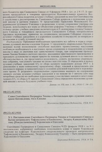 Постановление Святейшего Патриарха Тихона и Священного Синода о бьггии митрополиту Тифлисскому и Бакинскому, Экзарху Кавказскому Платону [Рождественскому] Херсонским и Одесским. № 1. 09(22).02.1918 г.