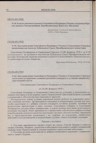 Постановление Святейшего Патриарха Тихона и Священного Синода о назначении настоятеля Лубенского Спасо-Преображенского монастыря. № 55. 15(28).02.1918 г. // Церковные Ведомости. 1918. № 9/10.