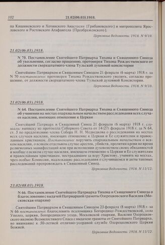 Постановление Святейшего Патриарха Тихона и Священного Синода об увольнении, согласно прошению, протоиерея Тихона Рождественского от должности сверхштатного члена Тульской духовной консистории. № 70. 21.02(06.03).1918 г. // Церковные Ведомости. 1918. № 9/10.