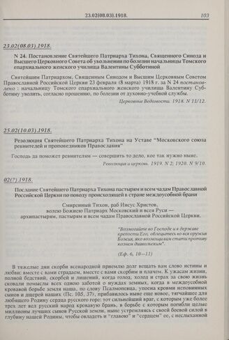 Постановление Святейшего Патриарха Тихона, Священного Синода и Высшего Церковного Совета об увольнении по болезни начальницы Томского епархиального женского училища Валентины Субботиной. 23.02(08.03). № 24. 1918 г.