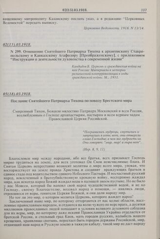 Отношение Святейшего Патриарха Тихона к архиепископу Ставропольскому и Кавказскому Агафодору [Преображенскому], с приложением «Инструкции о деятельности духовенства в современной жизни». № 299. 02(15).03.1918 г.