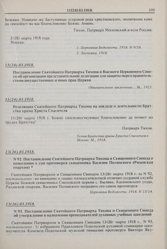 Постановление Святейшего Патриарха Тихона и Священного Синода об утверждении и назначении преподавателей духовных учебных заведений. № 93. 13(26).03.1918 г.