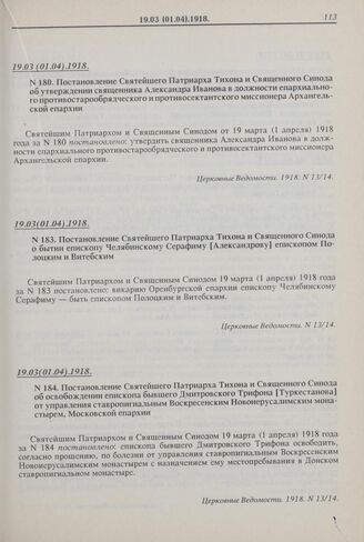 Постановление Святейшего Патриарха Тихона и Священного Синода об утверждении священника Александра Иванова в должности епархиального противостарообрядческого и противосектантского миссионера Архангельской епархии. № 180. 19.03 (01.04).1918 г.