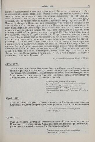 Определение Святейшего Патриарха Тихона и Священного Синода о бытии бывшему ректору Смоленской духовной семинарии архимандриту Дамиану [Воскресенскому] викарием Владимирской епархии, епископом Переславль-Залесским и о переименовании епископа Перес...