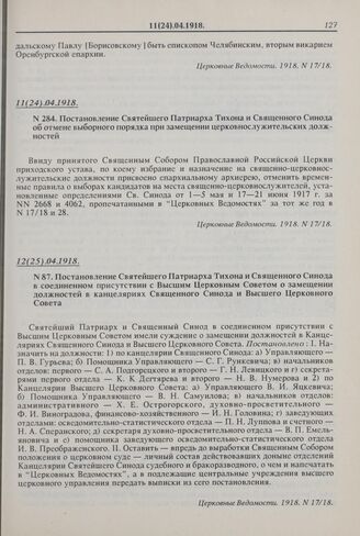 Постановление Святейшего Патриарха Тихона и Священного Синода в соединенном присутствии с Высшим Церковным Советом о замещении должностей в канцеляриях Священного Синода и Высшего Церковного Совета. № 87. 12(25).04.1918 г.