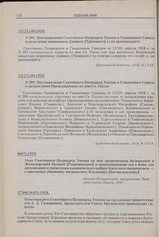 Постановление Святейшего Патриарха Тихона и Священного Синода о награждении Преосвященных ко дню Св. Пасхи. № 299. 12(25).04.1918 г.