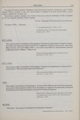 Постановление Святейшего Патриарха Тихона и Священного Синода о перенесении дня прославления святителя Софрония [Кристалевского], епископа Иркутского, на 22 октября 1918 г., согласно ходатайству (прошению) причта кафедрального собора г. Иркутска. 07(7).1918 г. // Петроградский Церковно-Епархиальный Вестник. 1918. № 22.