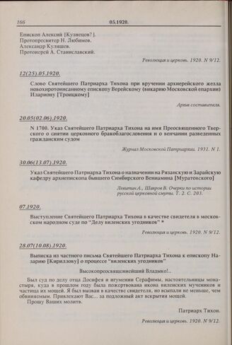 Указ Святейшего Патриарха Тихона на имя Преосвященного Тверского о снятии церковного бракоблагословения и о венчании разведенных гражданским судом. № 1700. 20.05(02.06).1920 г.