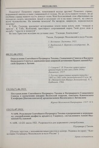 Определение Святейшего Патриарха Тихона, Священного Синода и Высшего Церковного Совета о даровании прав широкой автономии Православной Русской Церкви в Латвии. 08(21).06.1921 г.