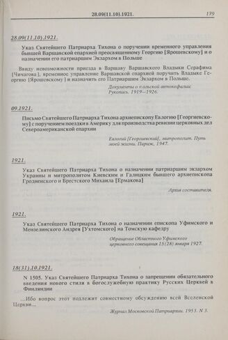 Письмо Святейшего Патриарха Тихона архиепископу Евлогию [Георгиевскому] с поручением поездки в Америку для производства ревизии церковных дел Североамериканской епархии. 09.1921 г. // Евлогий [Георгиевский], митрополит. Путь моей жизни. Париж, 1947.