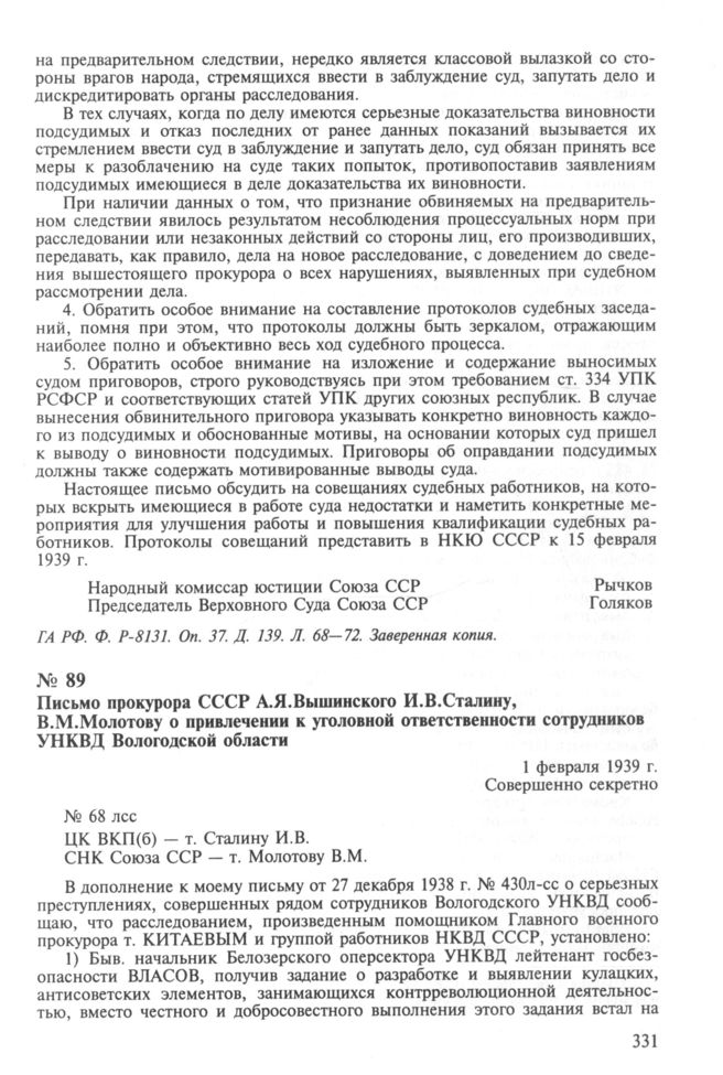 Письмо прокурора СССР А. Я. Вышинского И. В. Сталину, В. М. Молотову о привлечении к уголовной ответственности сотрудников УНКВД Вологодской области. 1 февраля 1939 г. // ГА РФ. Ф. P-8131. Оп. 37. Д. 140. Л. 24—25. Копия.