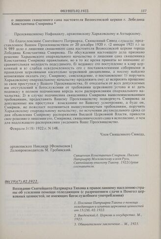 Воззвание Святейшего Патриарха Тихона к православному населению страны об усилении помощи голодающим (с разрешением сдачи в Помгол церковных ценностей, не имеющих богослужебного употребления). 06(19)(?).02.1922 г. // Послание Патриарха Тихона о помощи голодающим и изъятии церковных ценностей от 15(28).02.1922.; Введенский А. Церковь и государство. М., 1923.; Обвинительное заключение... М., 1923.