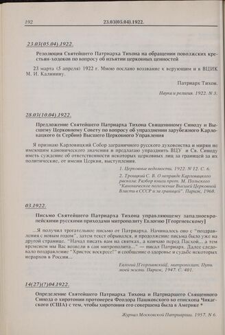 Акты Святейшего Тихона, Патриарха Московского и всея России, позднейшие документы и переписка о каноническом преемстве высшей церковной власти. 1917-1943 гг.: Сб. — М.: Изд-во Православ. Свято-Тихонов. Богослов. Ин-та, 1994.