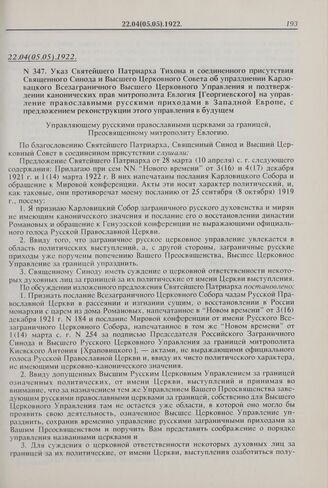 Указ Святейшего Патриарха Тихона и соединенного присутствия Священного Синода и Высшего Церковного Совета об упразднении Карловацкого Всезаграничного Высшего Церковного Управления и подтверждении канонических прав митрополита Евлогия [Георгиевского] на управление православными русскими приходами в Западной Европе, с предложением реконструкции этого управления в будущем. № 347. 22.04(05.05).1922 г.