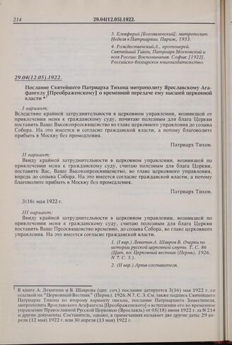 Послание Святейшего Патриарха Тихона митрополиту Ярославскому Агафангелу [Преображенскому] о временной передаче ему высшей церковной власти. 29.04(12.05).1922 г. // (I вар.) Левитин А. Шавров В. Очерки по истории русской церковной смуты. Т. С. 86 (Цит. по: Церковный вестник (Пермь). 1926. № 7.C.3.).; (II вар.) Архив составителя.; (II вар.) Введенский А., протоиерей. Церковь и революция: Уход Патриарха Тихона. Пг., 1922.; (I вар.) Послание митрополита Агафангела (Преображенского) от 05(18). 06.1922.; (III вар.) Затворник А. Обновленцы... Уфа, 1927.