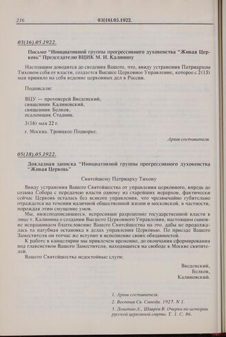 Письмо «Инициативной группы прогрессивного духовенства “Живая Церковь”» Председателю ВЦИК М.И. Калинину. 03(16).05.1922 г.
