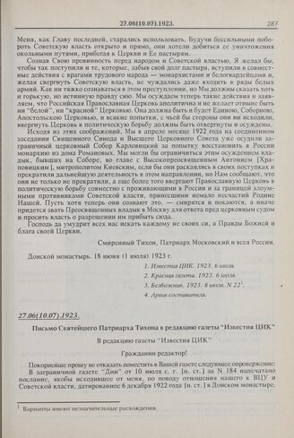 Письмо Святейшего Патриарха Тихона в редакцию газеты «Известия ЦИК». 7.06(10.07).1923 г. // Известия ЦИК. 1923. 11 июля. № 153 (1890).