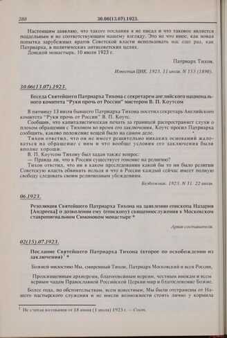 Послание Святейшего Патриарха Тихона (второе по освобождении из заключения). 02(15).07.1923 г. // Правда. 1922, 21 мая.; Прот. Введенский А.И. Революция и церковь. С. 28.; Известия ЦИК. 1922, 16 июня.; Затворник А. Обновленцы. Уфа, 1927.