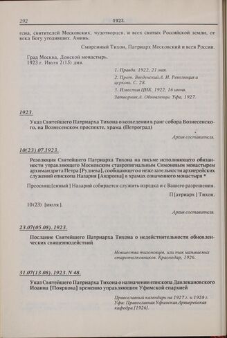 Акты Святейшего Тихона, Патриарха Московского и всея России, позднейшие документы и переписка о каноническом преемстве высшей церковной власти. 1917-1943 гг.: Сб. — М.: Изд-во Православ. Свято-Тихонов. Богослов. Ин-та, 1994.