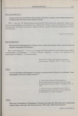 Акты Святейшего Тихона, Патриарха Московского и всея России, позднейшие документы и переписка о каноническом преемстве высшей церковной власти. 1917-1943 гг.: Сб. — М.: Изд-во Православ. Свято-Тихонов. Богослов. Ин-та, 1994.