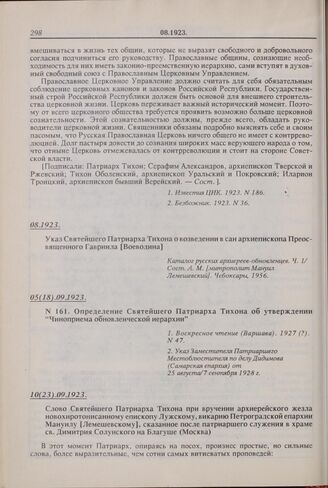 Слово Святейшего Патриарха Тихона при вручении архиерейского жезла новохиротонисанному епископу Лужскому, викарию Петроградской епархии Мануилу [Лемешевскому], сказанное после патриаршего служения в храме св. Димитрия Солунского на Благуше (Москва). 10(23).09.1923 г. // Левитин А., Шавров В. Очерки по истории русской церковной смуты. Т. 2. С. 228.