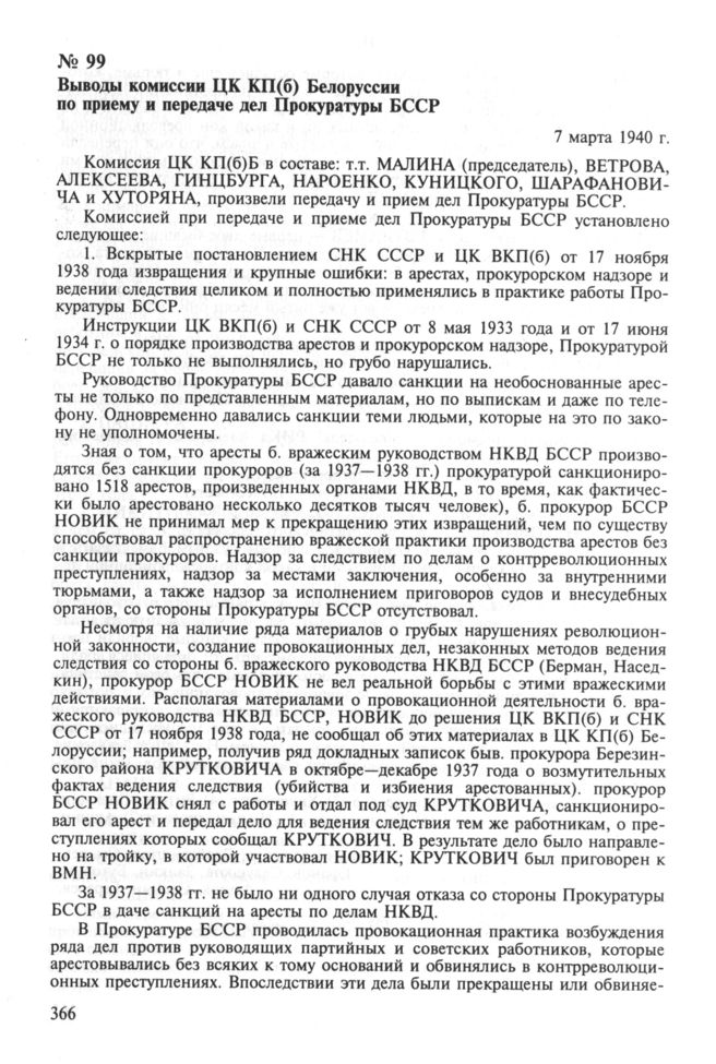Выводы комиссии ЦК КП(б) Белоруссии по приему и передаче дел Прокуратуры БССР. 7 марта 1940 г. // ГА РФ. Ф. P-8131. Оп. 37. Д. 230. Л. 67—78. Заверенная копия.