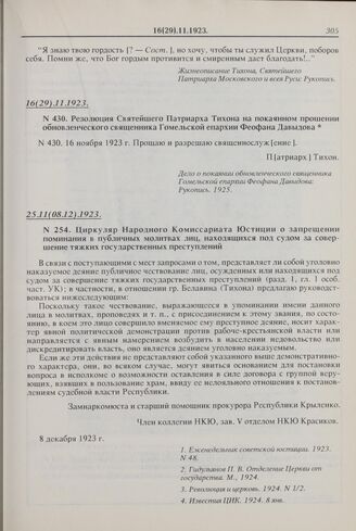 Резолюция Святейшего Патриарха Тихона на покаянном прошении обновленческого священника Гомельской епархии Феофана Давыдова. № 430. 16(29).11.1923 г.