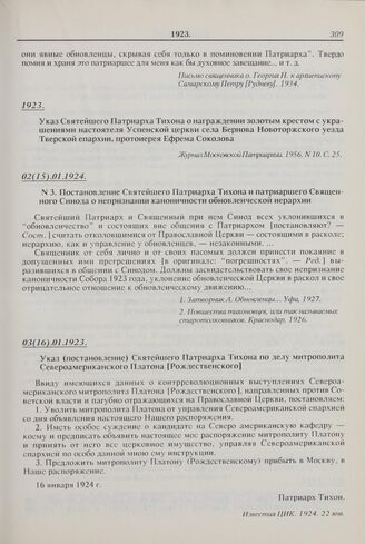Постановление Святейшего Патриарха Тихона и патриаршего Священного Синода о непризнании каноничности обновленческой иерархии. № 3. 02(15).01.1924 г. // Затворник А. Обновленцы... Уфа, 1927.; Новшества тихоновцев, или так называемых старотолковников. Краснодар, 1926.