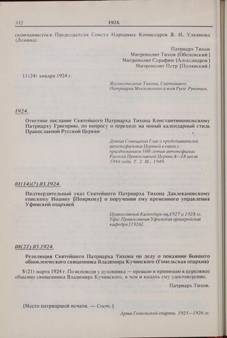 Подтвердительный указ Святейшего Патриарха Тихона Давлекановскому епископу Иоанну [Пояркову] о поручении ему временного управления Уфимской епархией. 01(14)(?).03.1924 г. // Православный Календарь на 1927 и 1928 гг. Уфа: Православная Уфимская архиерейская кафедра [1926].