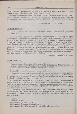 Постановление Святейшего Патриарха Тихона и вновь организовавшегося при нем Патриаршего Священного Синода, по вопросу о деятельности зарубежного русского Высшего Церковного Управления. 26.03(08.04).1924 г.