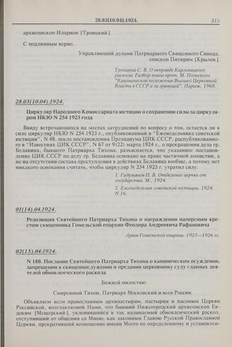 Послание Святейшего Патриарха Тихона о каноническом осуждении, запрещении в священнослужении и предании церковному суду главных деятелей обновленческого раскола. № 180. 02(15).04.1924 г.