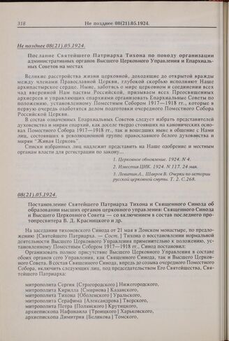 Послание Святейшего Патриарха Тихона по поводу организации административных органов Высшего Церковного Управления и Епархиальных Советов на местах. Не позднее 08(21).05.1924 г. // Церковное обновление. 1924. № 4.; Известия ЦИК. 1924. № 117. 24 мая.; Левитин А., Шавров В. Очерки по истории русской церковной смуты. Т. 2. С. 268.