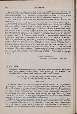 Заявление Святейшего Патриарха Тихона в Центральный Исполнительный Комитет по вопросам об отношении Православной Русской Церкви к календарной реформе (переходу на григорианский «новый» стиль). 17(30).09.1924 г. // Жизнеописание Тихона, Святейшего Патриарха Московского и всея Руси: Рукопись.