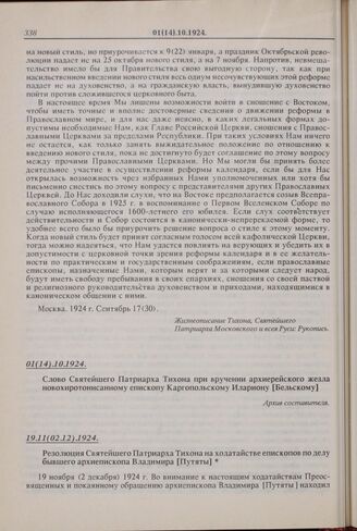 Резолюция Святейшего Патриарха Тихона на ходатайстве епископов по делу бывшего архиепископа Владимира [Путяты]. 19.11(02.12).1924 г.
