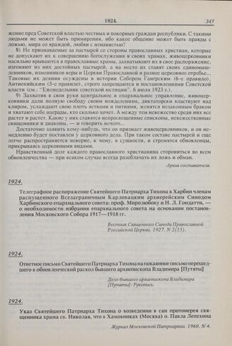 Акты Святейшего Тихона, Патриарха Московского и всея России, позднейшие документы и переписка о каноническом преемстве высшей церковной власти. 1917-1943 гг.: Сб. — М.: Изд-во Православ. Свято-Тихонов. Богослов. Ин-та, 1994.