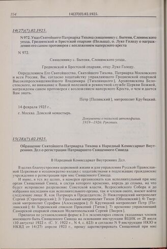 Указ Святейшего Патриарха Тихона священнику с. Бытеня, Слонимского уезда, Гродненской и Брестской епархии (Польша), о. Луке Голоду о награждении его саном протоиерея с возложением наперсного креста. № 972. 14(27)(?).02.1925 г. // Документы о польской автокефалии. 1919-1926: Рукопись.