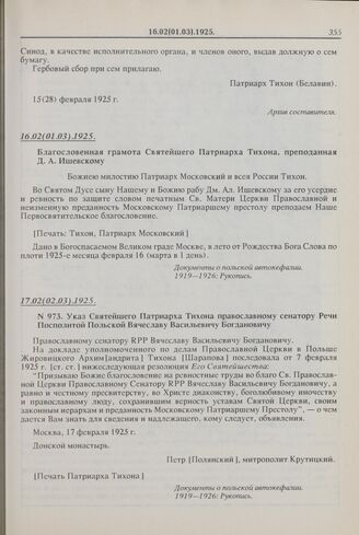 Благословенная грамота Святейшего Патриарха Тихона, преподанная Д.А. Ишевскому. 16.02(01.03).1925 г.