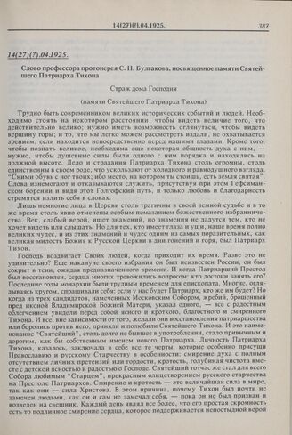 Слово профессора протоиерея С.Н. Булгакова, посвященное памяти Святейшего Патриарха Тихона. 14(27)(?).04.1925 г.