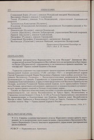 Послание митрополита Варшавского «и всея Польши» Дионисия [Валединского] на имя Патриаршего Местоблюстителя митрополита Крутицкого Петра [Полянского] с извещением о состоявшемся провозглашении «автокефалии» Православной Церкви в Польше. 12(25). 12.1925 г.