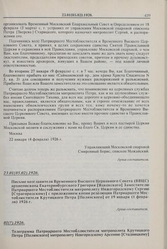 Телеграмма Патриаршего Местоблюстителя митрополита Крутицкого Петра [Полянского] митрополиту Новгородскому Арсению [Стадницкому] с приглашением последнего к участию во вновь организующемся коллегиальном Высшем Церковном Управлении. 01(?). 1926 г. // Послание Патриаршего Местоблюстителя митрополита Крутицкого Петра [Полянского]. Пермь. 19.12.1926 (01.01.1927).