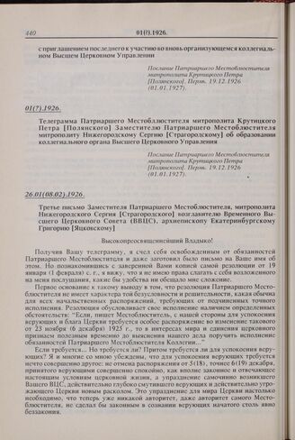 Третье письмо Заместителя Патриаршего Местоблюстителя, митрополита Нижегородского Сергия [Страгородского] возглавителю Временного Высшего Церковного Совета (ВВЦС), архиепископу Екатеринбургскому Григорию [Яцковскому]. 26.01(08.02).1926 г.