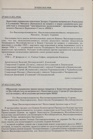 Донесение украинских епископов Экзарху Украины митрополиту Киевскому и Галицкому Михаилу [Ермакову] по вопросу о мерах канонического воздействия в отношении «григорианских раскольников», организаторов Временного Высшего Церковного Совета (ВВЦС). 27.02(12.03).1926 г. // Архив составителя.