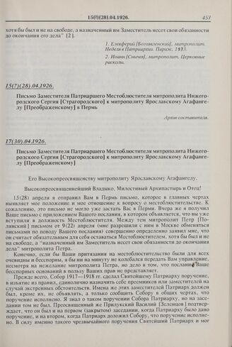 Письмо Заместителя Патриаршего Местоблюстителя митрополита Нижегородского Сергия [Страгородского] к митрополиту Ярославскому Агафангелу [Преображенскому] в Пермь. 15(?)(28).04.1926 г. // Архив составителя.