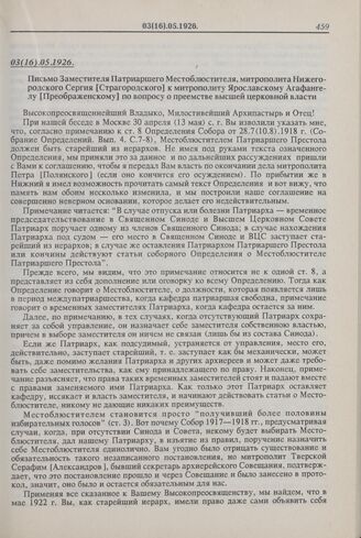 Письмо Заместителя Патриаршего Местоблюстителя, митрополита Нижегородского Сергия [Страгородского] к митрополиту Ярославскому Агафангелу [Преображенскому] по вопросу о преемстве высшей церковной власти. 03(16).05.1926 г.