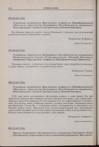 Телеграмма митрополита Ярославского Агафангела [Преображенского] (Ярославль) Заместителю Патриаршего Местоблюстителя митрополиту Нижегородскому Сергию [Страгородскому] (Нижний Новгород). 08(21).05.1926 г.