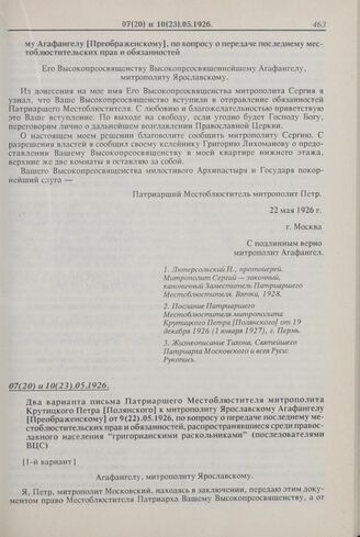 Два варианта письма Патриаршего Местоблюстителя митрополита Крутицкого Петра [Полянского] к митрополиту Ярославскому Агафангелу [Преображенскому] от 9(22).05.1926, по вопросу о передаче последнему местоблюстительских прав и обязанностей, распростр...