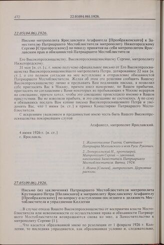 Письмо (из заключения) Патриаршего Местоблюстителя митрополита Крутицкого Петра [Полянского] к митрополиту Ярославскому Агафангелу [Преображенскому] по вопросу о вступлении последнего в должность Местоблюстителя и упразднении Коллегии. 27.05(09.06).1926 г. // Люперсолъский Н., протоиерей. Митрополит Сергий — законный, каноничный Заместитель Патриаршего Местоблюстителя. Вятка, 1928.; Иоанн [Снычев], митрополит. Церковные расколы.