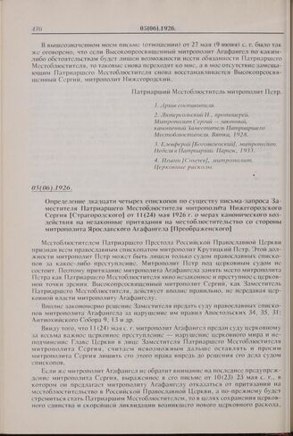 Определение двадцати четырех епископов по существу письма-запроса Заместителя Патриаршего Местоблюстителя митрополита Нижегородского Сергия [Страгородского] от 11(24) мая 1926 г. о мерах канонического воздействия на незаконные притязания на местоблюстительство со стороны митрополита Ярославского Агафангела [Преображенского]. 05(06).1926 г. // Иоанн [Снычев], митрополит. Церковные расколы.